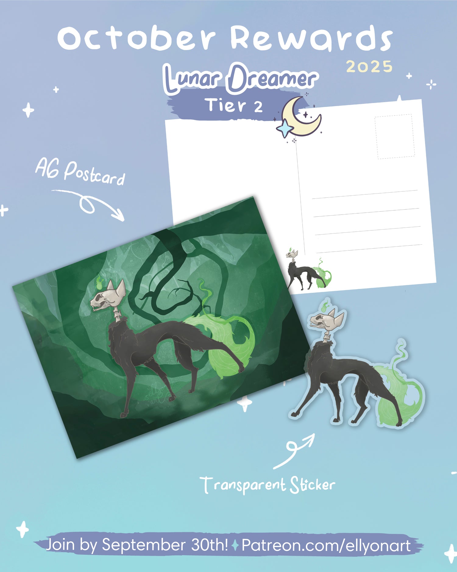 October reward for Tier 2 brings a cozy physical A6 Postcard & Sticker featuring Ghastly Cat!
